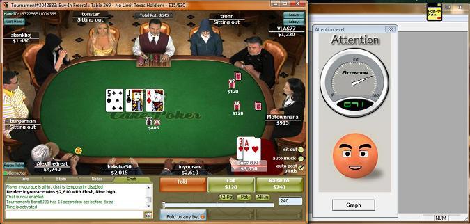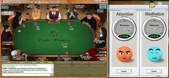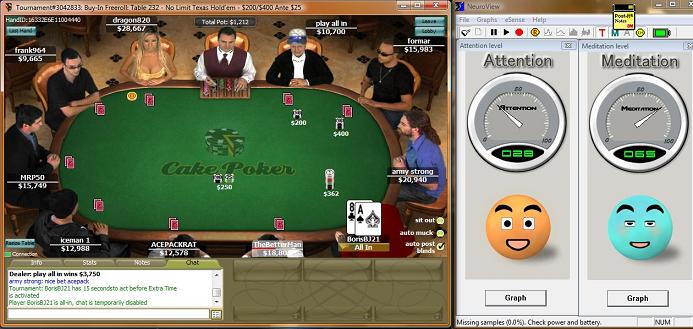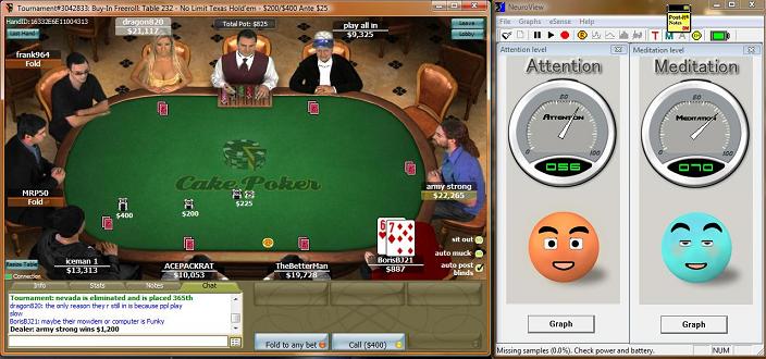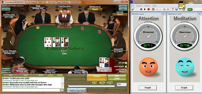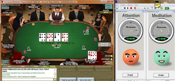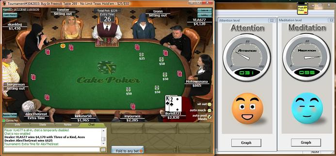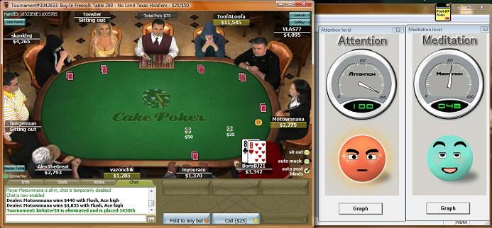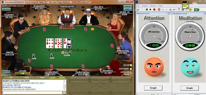 Playing poker (whether it be online or at a live tournament in a casino hotel is a skill that requires the individual to maintain a balance of brain, mind and body. As part of a product evaluation for the Neurkshy EM Headset, Ron Fitch has been investigating the use of on-the-spot Neurofeedback during online Texas Hold-em tournament play. This page shows a number of screens from actual play, showing you what cards were on the table along with an indication of Ron's ability to pay attention and/or relax at that moment in time. In a couple of examples, Ron shows us that it is possible to be extremely focused AND relaxed at the same. It should come as no surprise that this is the exact state we want our brain to be in during sustained physical exercise. E-Mail us for further details.